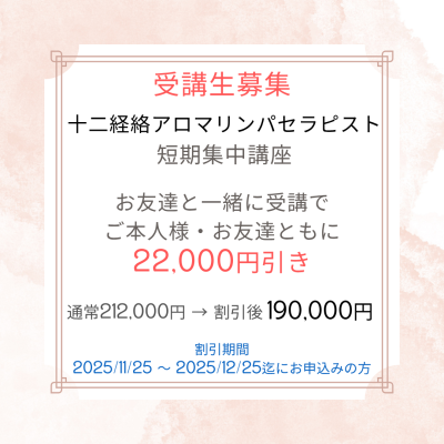 | ただ今、東京・鹿児島クラスにおいて、セラピスト養成講座の受講生を募集中 下記の期間中にお申込みいただいた方には、通常の受講料から10,000円引きさせていただきます |